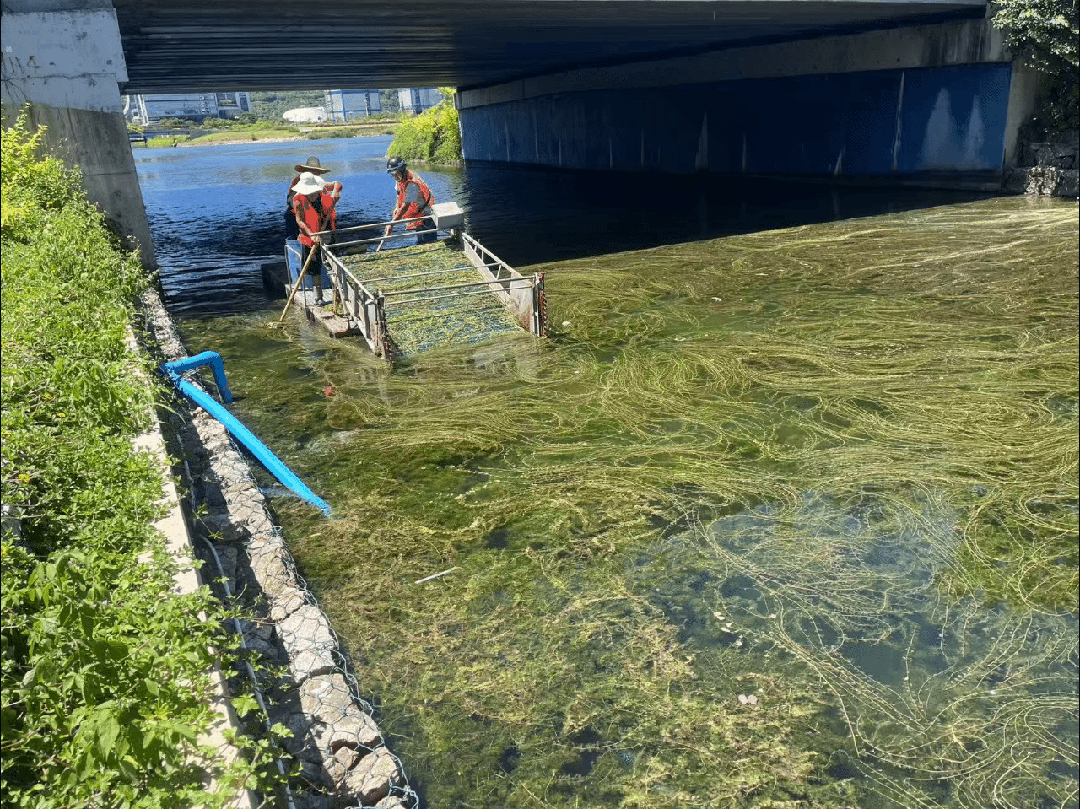 針對不同區(qū)域的水草特點,精準施策:大面積區(qū)域用機械打撈船快速收割;淺灘水草由專人下水割草;零散水草由保潔船只人工打撈;水面漂浮的斷根水草及浮萍,則利用攔污排攔截,防止擴散。